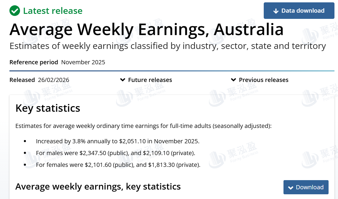 当地时间2月26日,澳洲统计局发布了一组最新数据:2025年11月全职成年人平均周薪(AWOTE)同比上涨3.9%。