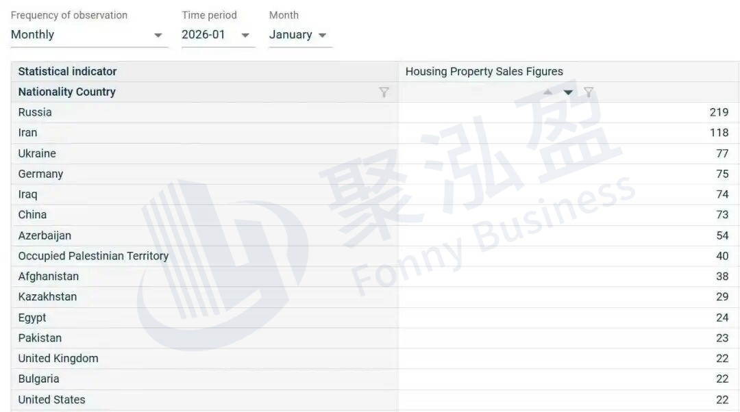 土耳其统计局公布的官方数据显示,2026年1月,外国投资者在土耳其共购置了1306套房产。其中俄罗斯、伊朗、乌克兰的买家稳居前三,德国、中国买家紧随其后;