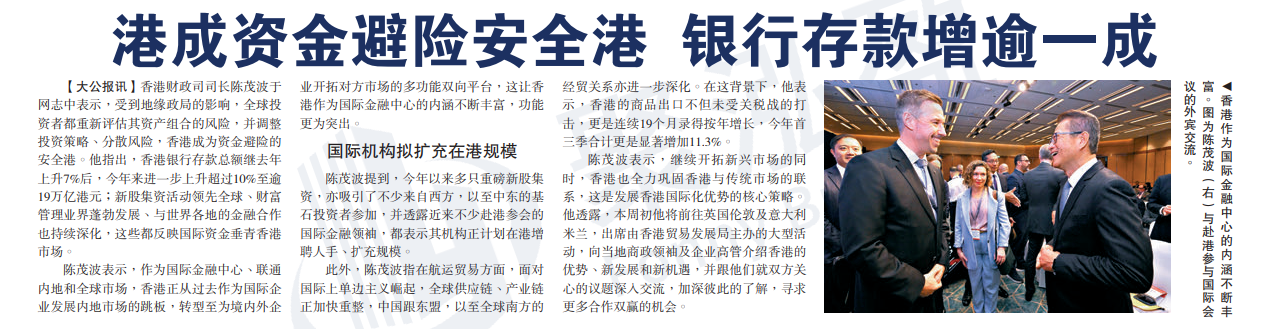 据财政司司长陈茂波透露,2025年香港银行存款总额继前一年上升7%后,去年来进一步上升超过10%至逾19万亿港元。