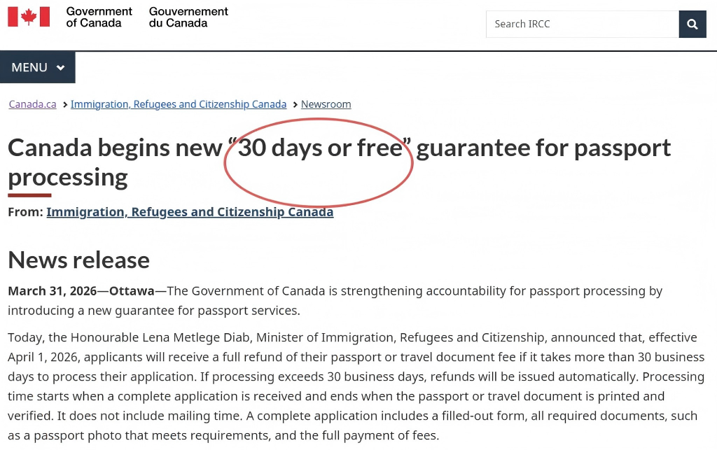 除了涨价,加拿大护照政策还引入一项关键调整:自4月1日起,护照申请必须在30个工作日内完成处理。若超时,政府将自动退还申请费用!