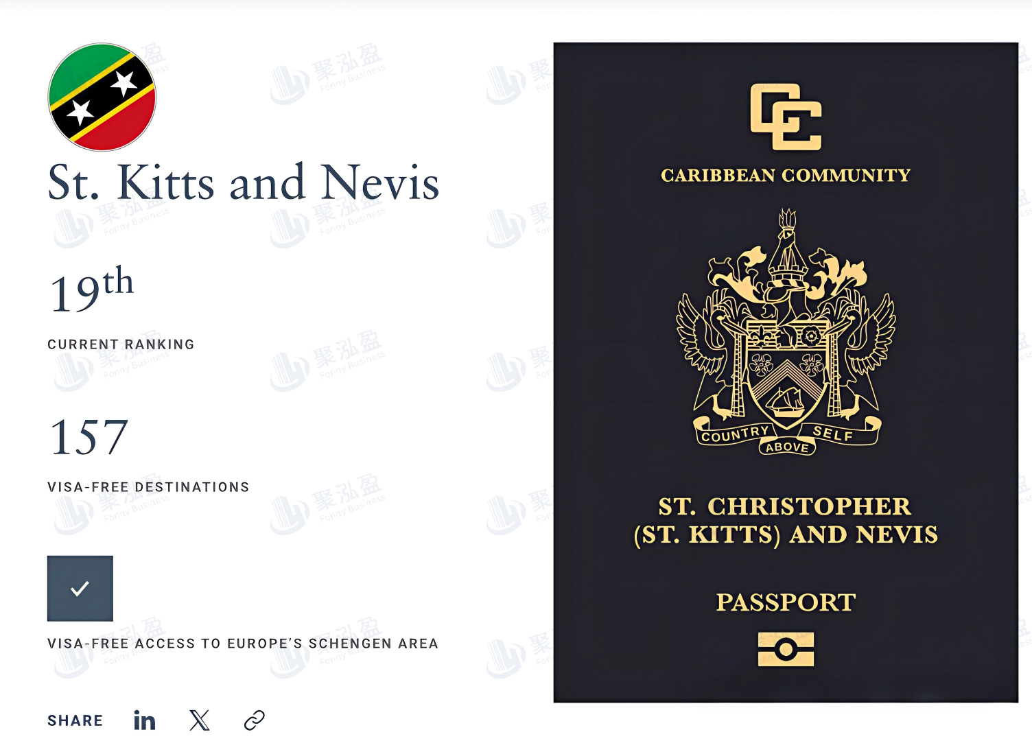 持圣基茨护照,可免签/落地签通行157国家和地区,覆盖欧盟申根国、英国、新加坡、中国香港等热门目的地。