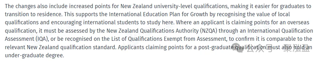 - 海外资格认定:若申请人凭借海外学历进行加分,该学历必须经由新西兰资格认证局(NZQA)完成国际资格评估(IQA),或被列入豁免评估的学历名单中,以确认其与新西兰相应学历水平相当。(中国免于评估的高校和学历名单,请点击往期文章查看)