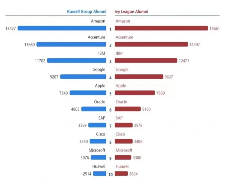 值得注意的是,国内科技巨头“华为(Huawei)"也上榜了,华为目前共有2514名和2624名员工,他们分别毕业于“英国罗素大学”和“美国常春藤”。